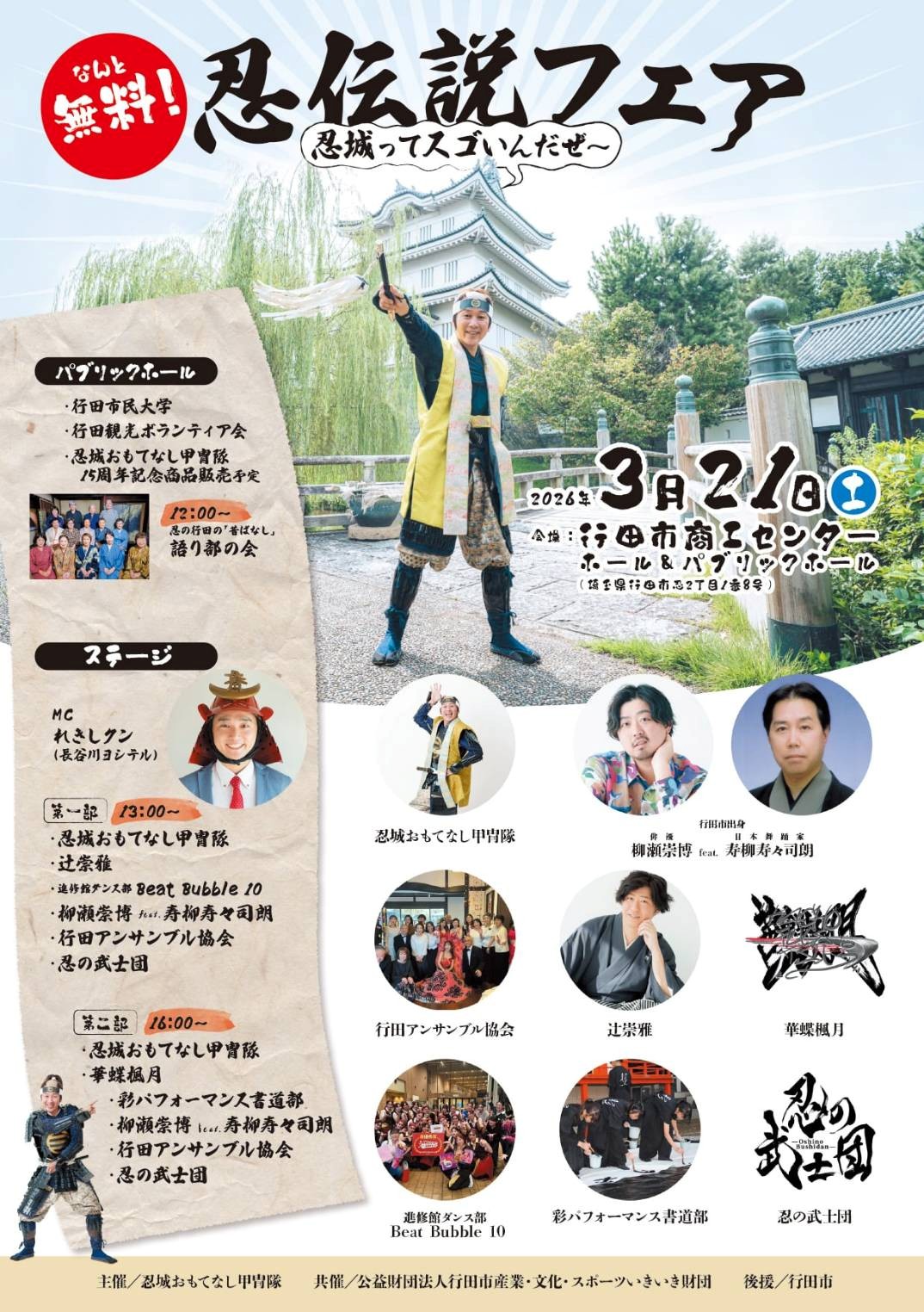 忍城おもてなし甲冑隊や行田アンサンブル協会や進修館高校ダンス部などが出演予定